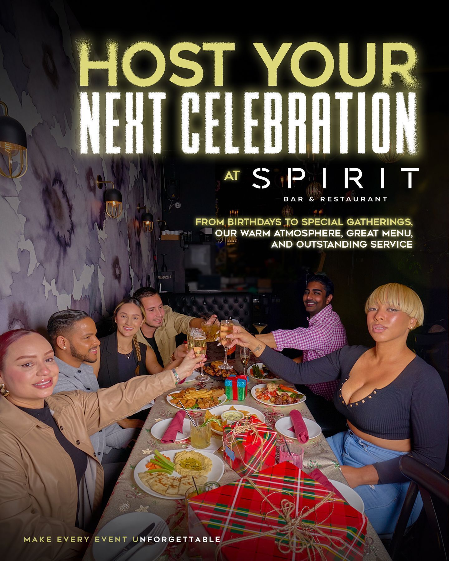 Host an unforgettable private party at Spirit Restaurant & Bar in Edgewater, NJ. Whether it’s a birthday, anniversary, or special gathering, our inviting atmosphere, delicious menu options, and exceptional service make every event feel exclusive. Create lasting memories and let Spirit set the perfect mood for your celebration